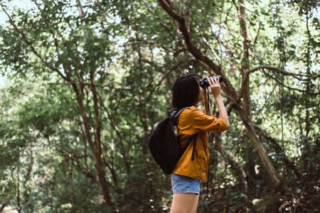 Portrait of travel young asian woman using binoculars in forest,Enjoying with bird watching