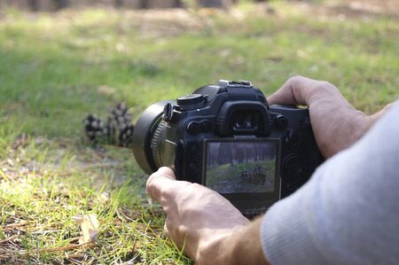 The men photographs pine cones in the forest