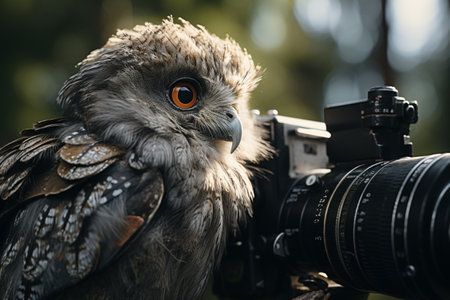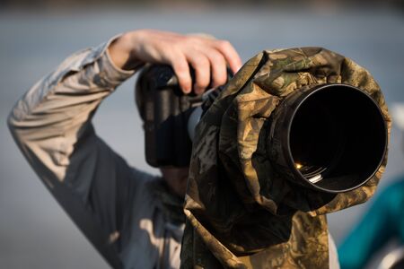 Photographer takes a photo with a large lens .
