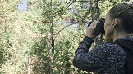 Traveler photographing scenic view in forest. One caucasian woman shooting nice magic look. Girl take photo video on dslr mirrorless camera. Professional photographer travel with backpack. Outdoor.