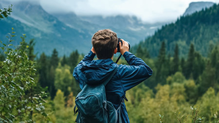 Young photographer is capturing the beauty of a mountain forest landscape with his camera