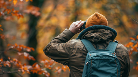 A man in a hat taking pictures of the forest, AI