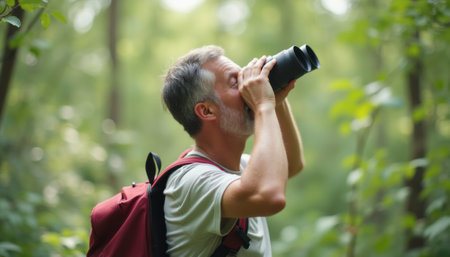Senior hiker looking through binoculars in forest, banner