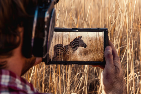 A man is holding a cell phone up to his face, looking at a zebra on the screen. Concept of wonder and excitement as the viewer watches the zebra in its natural habitat