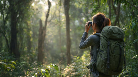 A person stands in a lush forest, capturing the beauty of nature with a camera. Sunlight filters through trees, creating a serene atmosphere for exploration.