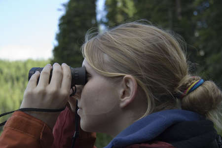 young woman with a field glass - watching wildlife