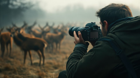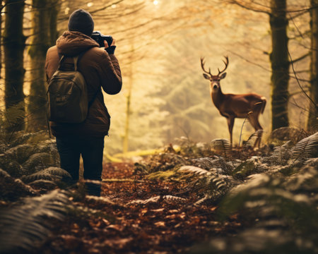 An AI generated illustration of a male photographer capturing a wild deer with his camera