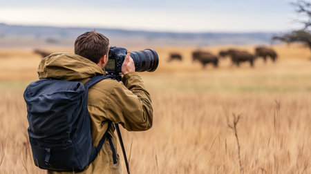 Professional wildlife photographer taking pictures of wild animals in the savannah.