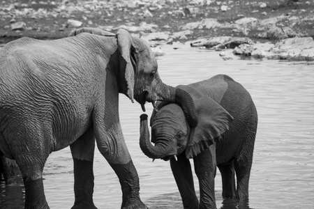 B&W mother & juvenile elephants in Etosha National Park, Namibia.