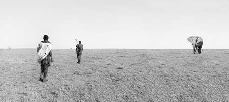 Maasai Askari walking in the wild with and elephant in black and white hikey