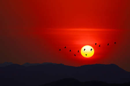 sunset on evening sky over silhouette mountain and birds flying on the red sky