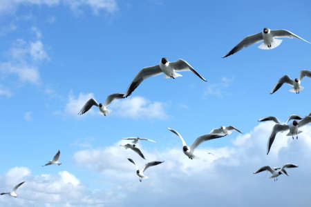 Seagulls flying over the sea waves. Seagulls on the beach of Olimp on a cloudy and stormy day, Romania.