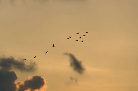 Beautiful sky on sunset or sunrise with flying birds natural background