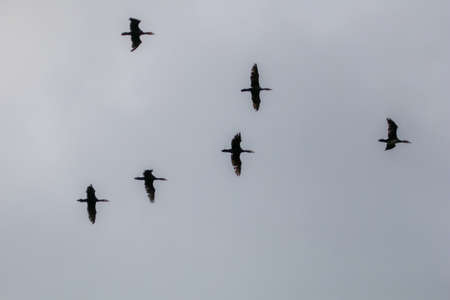 Remote photo a flock of Egrets birds are flying in the sky. Flying around in the sky. Egret isolated