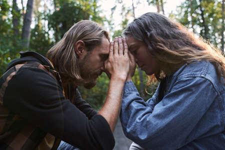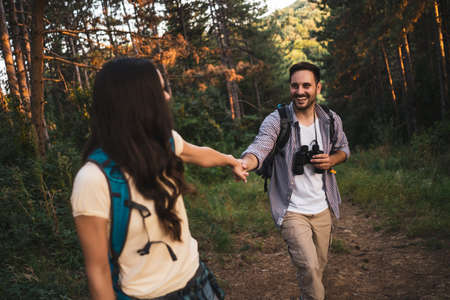 Couple holding hands enjoying trip while vacation day. Hikers with backpacks walking on forest path on sunny day. Active leisure time close to nature