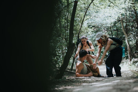 Friends helping injured hiker in forest on sunny day