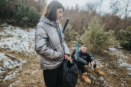Two people taking a break during a winter hiking trip in a countryside forest setting