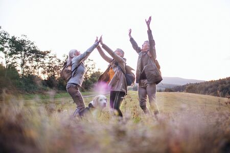 Senior women friends with dog on walk outdoors in nature.