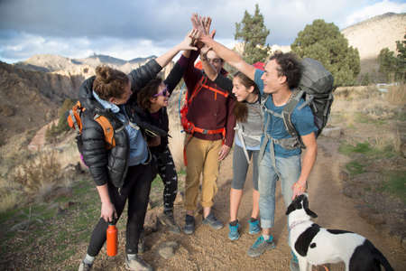 Group of happy friends music jumps trekking fun