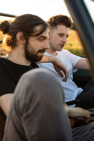 Tired young boys models sitting in the car