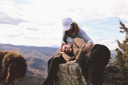 beautiful couple and a dog have a rest near the road and on a hill