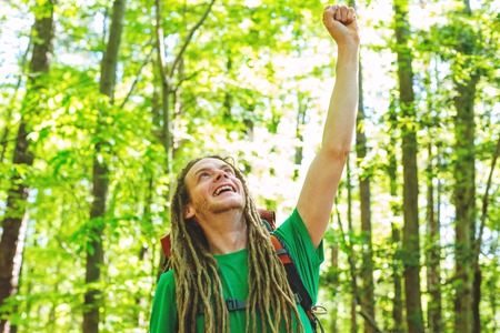 Happy hiker raising his hands in the air in a victory salute in the forest