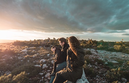 Three male hiking friends enjoying a scenic view at the peak of a mountain on a cloudy day in Spain