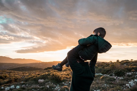 Father with his child on his shoulders at sunset. Concept of happiness and love between dad and son
