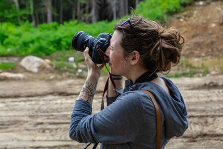 Traveler photographing scenic view in forest. One caucasian woman shooting nice magic look. Girl take photo video on dslr mirrorless camera. Professional photographer travel with backpack. Outdoor.