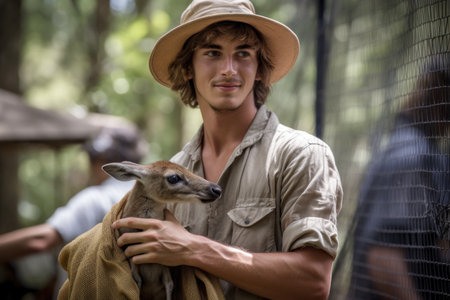 a young man holding a kangaroo during an outdoor exhibition in the forest, created with generative ai
