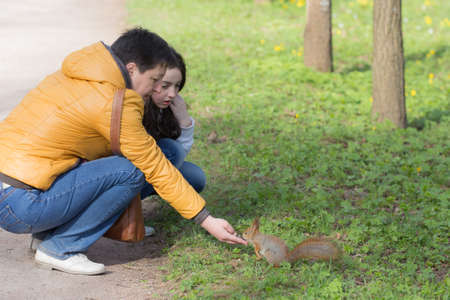 Young woman in hat with long hair feeding funny squirrel in pine forest