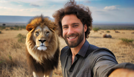 A photographer in a green jacket kneels to capture a photo of a lioness in a grassy field. The close interaction highlights the trust and harmony between human and wildlife. AI generation