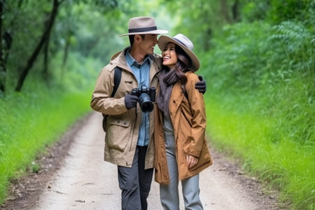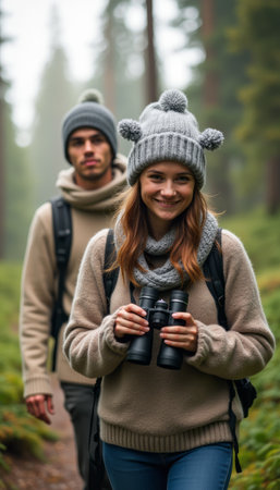 A cheerful woman holds binoculars while walking through a lush, misty forest alongside her partner. Their cozy outfits and joyful expressions capture the essence of adventure and connection with nature.