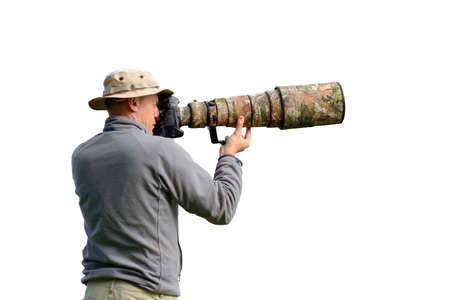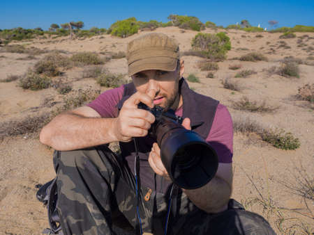 Close up pictire of a ohotographer in savanna taking a picture of a wild life of an animals.