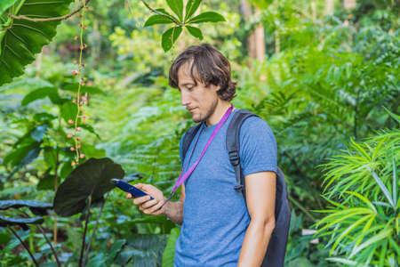 Mature environmentalist analyzing leaves in lush forest, demonstrating sustainable forestry and conservation