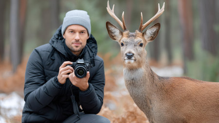 Photographer kneeling in forest with camera, capturing a wild deer looking at camera
