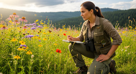 A realistic photograph of a female botanist in a lush botanical garden, meticulously examining a pink orchid with a magnifying glass while holding a field notebook