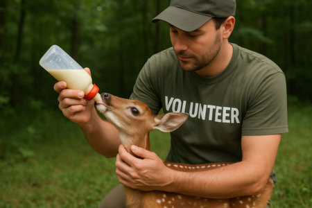 Wildlife volunteer caring for an orphaned fawn, gently bottle feeding milk in a serene forest setting, promoting compassion and conservation