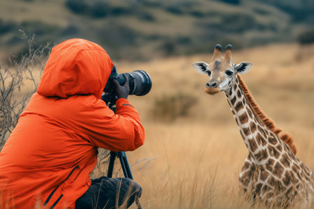 Wildlife photographer capturing stunning images of a giraffe roaming freely in the vast African savanna, surrounded by natural beauty