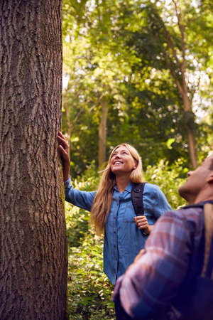 Woman In Countryside Hiking Along Path Through Forest Taking Photo On Mobile Phone