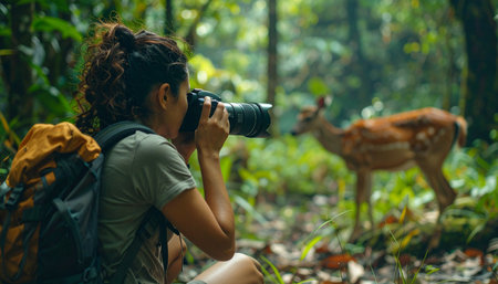 A dedicated wildlife photographer captures a serene moment with a deer in the lush, green jungle. Ai-Generated.