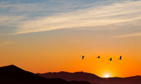 Sandhill Cranes in Flight at Sunrise Panoramic View