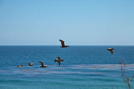California coastline landscape. Rocky cliffs and native plants on the beach at sunset, and silhouette of flying birds with cloudy sky on background. Dramatic seascape, copy space