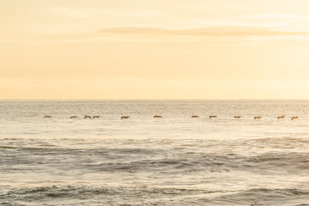 flock of black swans flying above the Indian Ocen shot from City Beach in Perth, Western Australia