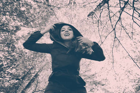 Portrait of a beautiful young woman in raincoat in forest.