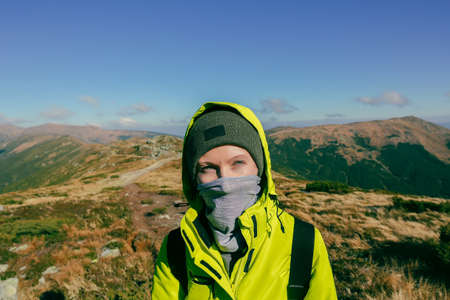 hiking woman with covered face