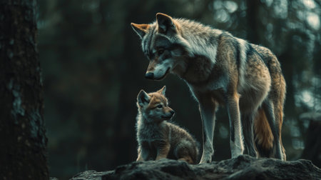 Amidst shadows dark forest adult wolf keeps vigilant watch its curious cub embodying bond family and natures beauty.