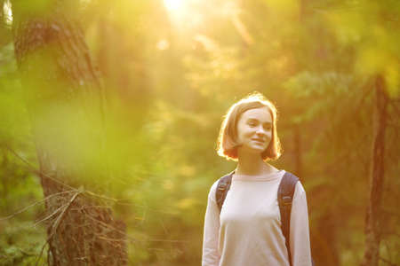 Photo of happy young lady standing in the forest. Looking aside.