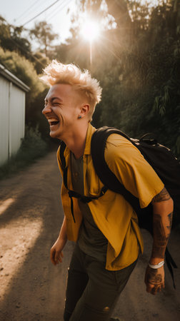 Happy young man with backpack walking on the road in the forest.