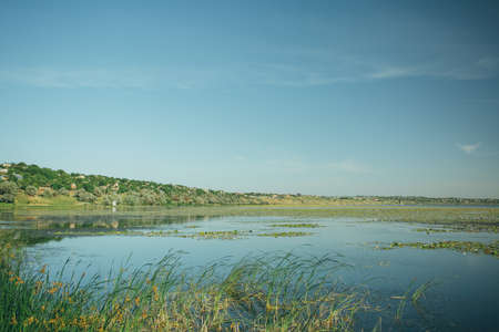 Small lake under nice sky. Landscape with bog in steppe in nice summer day. summer scene on lake
